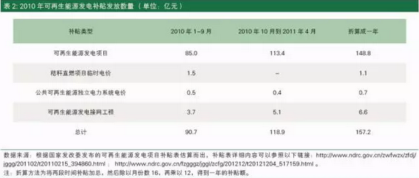 以2010年為比較年份。圖1顯示,2010年的電價附加征收額為154億元。表2顯示,折算后的2010年可再生能源發電項目補貼為157.2億元。二者之間基本一致,可以說2010年可再生能源發電項目補貼基本沒有缺口。