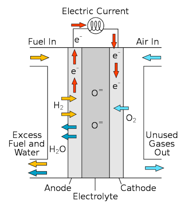 固態(tài)氧化物燃料電池工作原理。[3]