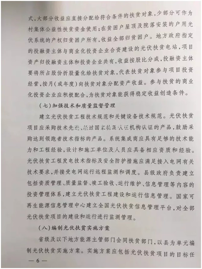 采用村級光伏電站(含戶用)方式,每位扶貧對象的對應項目規模標準為5千瓦;采取集中式光伏電站方式,每位扶貧對象的對應項目規模標準為25千瓦。