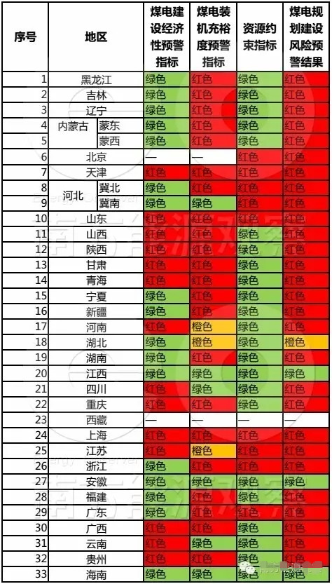 煤電建設(shè)經(jīng)濟(jì)性預(yù)警指標(biāo)是基于3年后各省(區(qū)、市)新投運(yùn)煤電項(xiàng)目的投資回報(bào)率。投資回報(bào)率低于當(dāng)期中長(zhǎng)期國(guó)債利率的為紅色預(yù)警;在當(dāng)期中長(zhǎng)期國(guó)債利率至一般項(xiàng)目收益率(電力項(xiàng)目通常為8%)為橙色預(yù)警;高于一般項(xiàng)目收益率的為綠色。
