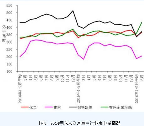 1-3月份,化學原料制品、非金屬礦物制品、黑色金屬冶煉和有色金屬冶煉四大高載能行業用電量合計3816億千瓦時,同比下降5.8%,增速比上年同期回落4.5個百分點;合計用電量占全社會用電量的比重為28.2%,對全社會用電量增長的貢獻率為-55.0%。其中,化工行業用電量1044億千瓦時,同比增長3.4%,增速比上年同期回落0.2個百分點;建材行業用電量578億千瓦時,同比下降4.7%,增速比上年同期回落0.2個百分點;黑色金屬冶煉行業用電量1042億千瓦時,同比下降14.0%,增速比上年同期回落7.2個百分點;有色金屬冶煉行業1152億千瓦時,同比下降5.7%,增速比上年同期回落8.8個百分點。