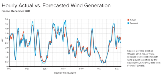 這種穩定和可靠的電力供應依靠的是對許多變量的籌劃調控,所以必須準確預報電力輸出的變化。盡管準確性還有待提高,但是預報能力的發展已經實現了光伏發電和風力發電比電力需求更容易預測。例如,在一個多暴風雨的冬季月份,法國電網運營商報告的全國實際風力發電量與其提前一天預報的發電量(見如下圖示)已十分接近。較少的誤差在電能實際調度上網前的幾個小時內也消失了。
