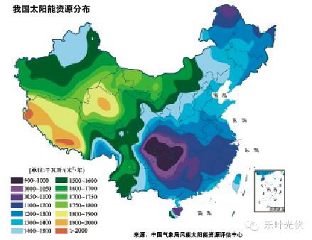 中國陸地面積每年接收的太陽輻射總量為3.3×103~8.4×103MJ/m2。盡管我國屬太陽能資源豐富的國家之一,全國總面積2/3以上地區(qū)年日照時(shí)數(shù)大于2000小時(shí)。但仍有一部分區(qū)域日照條件不行,即全年輻射量在4200MJ/m2以下的太陽能資源四類地區(qū),這也是我國太陽能資源最少的地區(qū)。這其中主要包括四川、貴州兩省。