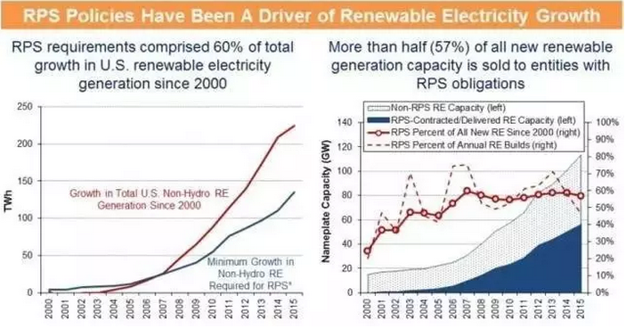 自2000年以來有超過一半的可再生能源發電量(60%)是源于各州可再生能源配額制政策的出臺。