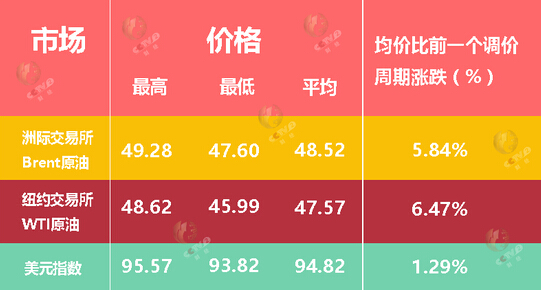 5月24日,因美國原油庫存減少,價格再度上漲,布倫特、WTI原油期貨收盤價格分別為48.61美元、48.62美元,其中WTI原油期貨價格再創去年10月以來的新高,比國內成品油調價前分別上漲6.8%、9.2%。