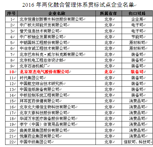 日前,工信部發布了《關于公布2016年兩化融合管理體系貫標試點企業名單的通知》(工信廳信軟函〔2016〕359號)。北京市共有22家企業評選為兩化融合管理體系貫標試點企業(詳見附表)。北京雙杰電氣股份有限公司(下文簡稱:雙杰電氣,股票代碼:300444)作為民族電力設備制造企業榜上有名,順利通過兩化融合管理體系貫標試點企業評定,成為全國兩化融合管理體系貫標試點評定企業之一。