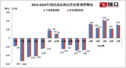 2015-2016年國(guó)內(nèi)成品油歷次價(jià)格調(diào)整概況。來源隆眾石化網(wǎng)