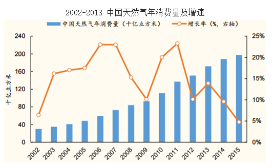 2014 到 2015 年,中國天然氣發展面臨挑戰。2014 年以來,國內天然氣 市場增速出現了明顯下降,2014 年降至 9.58%,2015 年則進一步下降到 4.5%,與 2002-13 年年均 16%的增速相去甚遠。天然氣產業發展增速降 低主要是由需求放緩和比價關系惡化造成,其具體原因如下: