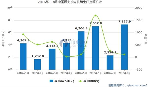 2016年1-8月風(fēng)電發(fā)電機(jī)組出口金額同比增長208.2%