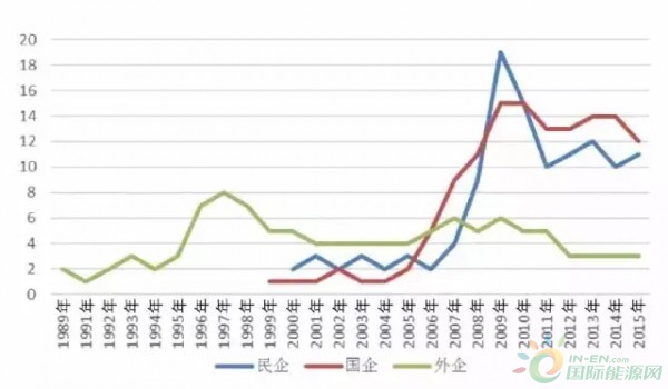 風(fēng)電開發(fā)企業(yè)主要為中國企業(yè),外商投資企業(yè)進(jìn)入中國市場非常有限。在國企中,主要分布有中央直屬企業(yè)和地方國企。從風(fēng)電開發(fā)企業(yè)數(shù)量變化看,2004年以前,不足10家企業(yè),從2005年起逐年增長,到2013年超過80家,其中央企17家,地方國企26家,民企41家(國企和民企均超過40家,在此期間,國企的數(shù)量一直比民企多);到2015年,企業(yè)數(shù)量共計(jì)超過100家企業(yè),民企數(shù)量突破60家,超過國企,央企和地方國企數(shù)量與2013年相比變化不大。