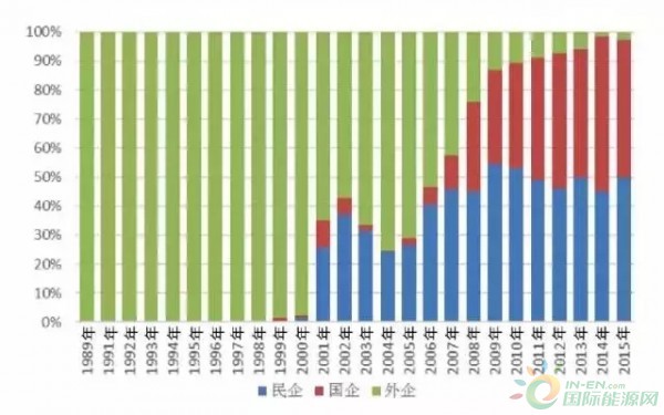 從風(fēng)電制造企業(yè)歷年新增裝機(jī)容量看,2000年之前,外企獨(dú)占整個(gè)中國風(fēng)電市場。2001年起中國風(fēng)電市場格局發(fā)生改變,中國企業(yè)勢(shì)力開始增強(qiáng),市場占有率達(dá)到35.4%(民企25.9%,國企9.5%),外企下降到64.6%。但2003年至2004年,中國企業(yè)出現(xiàn)萎縮,2004年占有率下降到不足25%,且?guī)缀跞縼碜悦衿螅馄笫袌稣加新蔬_(dá)到75%。2005年,隨著中國企業(yè)數(shù)量的增加,市場占有率也在逐年攀升,尤其國企增長明顯,從圖2可以看出,外企的市場份額逐漸被國企吞噬。2014年中國企業(yè)市場占有率達(dá)到歷史高點(diǎn)98.3%(民企45.3%,國企53%),外企1.7%。