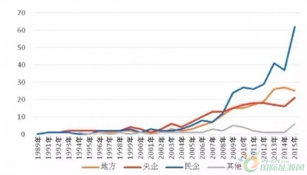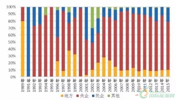 從歷年新增裝機(jī)的市場占有率看,從2005年到2015年,國企的市場占有率均超過80%,在2008年最高達(dá)到95%,之后又回落在80%至90%之間,其中,央企的市場占有率達(dá)到70%至80%之間,而地方國企僅占10%左右。從2009年至2015年,民企市場占有率整體趨勢(shì)顯示增強(qiáng),尤其在2013年和2014年,民企市場占有率達(dá)到20%左右。