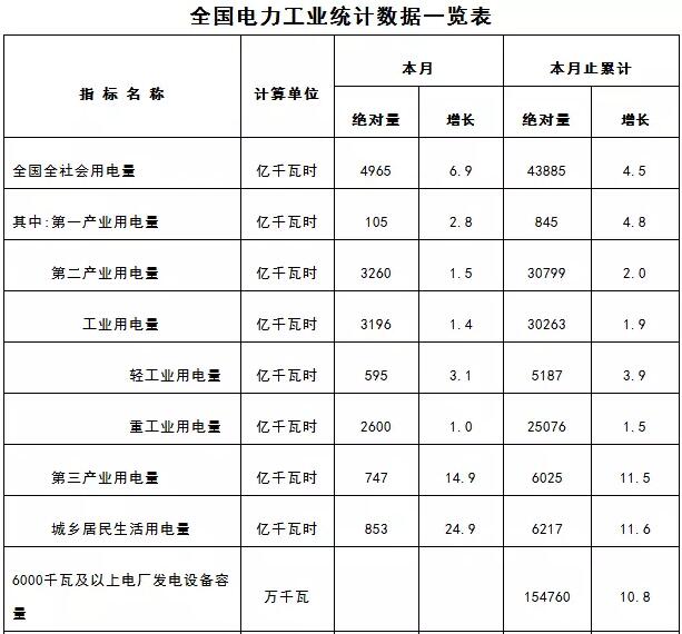 10月17日,國家能源局發布9月份全社會用電量4965億千瓦時,同比增長6.9%;1-9月,全國全社會用電量累計43885億千瓦時,同比增長4.5%。