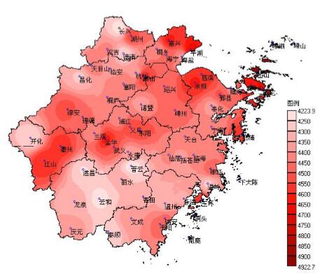 圖1 浙江省多年平均年總輻射分布圖(兆焦/平方米)