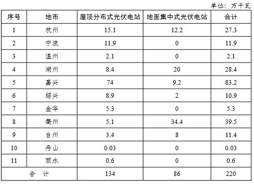 單位:萬千瓦序號地市屋頂分布式光伏電站地面集中式光伏電站合計1杭州15.112.227.32寧波11.9011.93溫州2.102.14湖州8.42028.45嘉興749.283.26紹興8.9210.97金華5.305.38衢州5.134.439.59臺州3.4811.410舟山0.0300.0311麗水0.600.6合計13486220