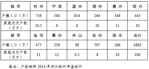 隨著浙江省新型城鎮(zhèn)化進程快速推進,集約、智能、綠色、低碳的新型城鎮(zhèn)化需要大規(guī)模清潔能源的支撐,給工業(yè)園區(qū)、公共建筑、工商企業(yè)屋頂建設(shè)分布式光伏發(fā)電帶來契機。初步統(tǒng)計,浙江省有效面積3000平方米以上以工業(yè)園區(qū)、公共建筑為主的建筑屋頂面積約4000萬平方米,可安裝分布式光伏500萬千瓦以上。同時,隨著浙江省美麗鄉(xiāng)村建設(shè)以及城鄉(xiāng)居民生活水平提高和綠色用能理念深入,民居建筑建設(shè)家庭屋頂光伏成為新的應(yīng)用空間。根據(jù)統(tǒng)計年鑒,2014年浙江省戶籍?dāng)?shù)為1630萬戶,按6%的居民住戶安裝家庭屋頂光伏,全省可開發(fā)100萬戶家庭屋頂光伏,總規(guī)模約300萬千瓦。