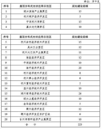 (一)分布式光伏示范園區(qū)工程加快建設(shè)嘉興光伏高新區(qū)、杭州桐廬經(jīng)濟開發(fā)區(qū)、海寧經(jīng)濟開發(fā)區(qū)等國家級屋頂分布式光伏示范區(qū)。同時,進一步挖掘省內(nèi)經(jīng)濟發(fā)達、用電負荷大的工業(yè)園區(qū)、經(jīng)濟技術(shù)開發(fā)區(qū)等集中連片工商企業(yè)廠房屋頂,新建省級屋頂分布式光伏發(fā)電應(yīng)用示范區(qū)。到2020年,全省建成裝機5萬千瓦以上大型屋頂分布式光伏發(fā)電應(yīng)用示范園區(qū)20個以上。