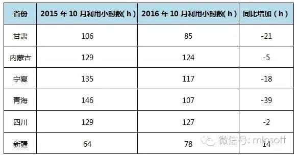 由以上圖表可以看出,2016年10月,新疆平均利用小時數比去年同期增加14小時,四川與去年同期基本持平,其他四省與去年同期相比均有不同程度降低。其中新疆10月平均利用小時數為78小時,比去年同期增加14小時;四川10月平均利用小時數為127小時,比去年同期減少2小時;內蒙古10月平均利用小時數為124小時,比去年同期減少5小時;青海10月平均利用小數與去年同期相比變化最為劇烈,減少39小時;甘肅其次,比去年同期減少了21小時;寧夏10月平均利用小數也比去年同期減少了18小時。