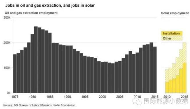 根據美國勞工部和太陽能基金會的數據,2015年美國太陽能(主要是光伏)領域就業人數達到20萬人,超過了油氣上游(開采)企業的就業人數。而在光伏就業崗位中,超過大約60%從事光伏安裝工作。