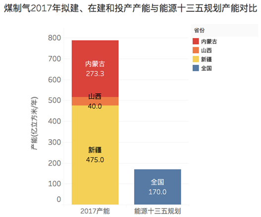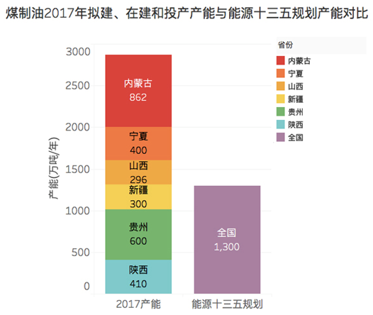 而根據綠色和平的統計,截至2017年1月,中國現投產的煤制油、煤制氣項目產能分別為818萬噸和51.05億立方米,加上在建和已經拿到路條隨時可能開建的項目,符合“十三五”建設條件的地區煤制油、煤制氣產能總計達到了2868萬噸和788.3億立方米,遠遠超出了“十三五”規劃產能。