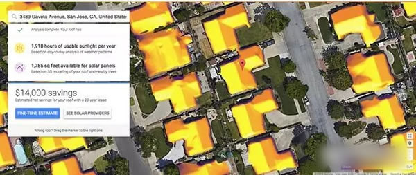 使用方法也很簡單,通過輸入自家地址,可以看到自家屋頂一年可以接收多少太陽能進行發電,屋頂又有多少面積可供安裝太陽能電池板,還能計算出安裝太陽能電池板后能省下多少電費。