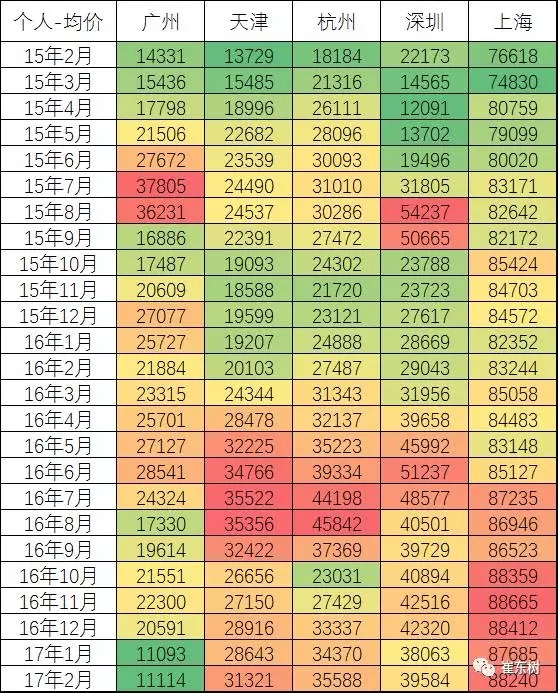 前期隨著深圳房價暴漲,因此前幾個月的個人拍牌價格偏高,但隨著經濟下行壓力和單位用戶購買力不足,個人拍牌價格也出現下調趨勢。16年12月的廣州價格下降到1.9萬,相對去年7-8月的高價下跌較多。深圳也是暴跌一些,天津和杭州16年初較高點大幅下降,目前進入暴增期。隨著今年的房價暴漲,需求心態不穩,7-8月汽車拍牌價格增長速度很快。目前天津和杭州的牌照拍牌價格創出新高,深圳處于次新高狀態,有利于新能源車的銷售。尤其是深圳16年的牌照價格暴增到5.1萬,今年2月降到3.9萬,拍牌的價格波動較大。近幾個月的各城市拍牌價分化,上海的8.8萬仍是還有些其他費用的,因此上海新能源車市場更火爆。