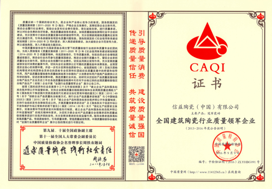 為了嚴(yán)格把控冠軍標(biāo)準(zhǔn),冠軍磁磚在產(chǎn)品生產(chǎn)的過程中,通過國際標(biāo)準(zhǔn)檢驗(yàn)及計(jì)量檢測(cè)設(shè)備完成自檢、互檢、抽檢等質(zhì)檢程序,堅(jiān)持定期審核,保證產(chǎn)品合格率達(dá)到98%以上。2013年冠軍磁磚更是推出了15年質(zhì)保服務(wù),以15年的時(shí)間來承諾消費(fèi)者,保證產(chǎn)品“無變形、無褪色、無龜裂”,因此2016年“冠軍磁磚”被江蘇省授予“江蘇名牌產(chǎn)品證書”;同年被中國質(zhì)量檢驗(yàn)協(xié)會(huì)授予“全國建筑陶瓷行業(yè)質(zhì)量領(lǐng)軍企業(yè)”,這不僅是對(duì)冠軍磁磚對(duì)品質(zhì)重視的結(jié)果,也是廣大消費(fèi)者對(duì)冠軍品質(zhì)的認(rèn)可。