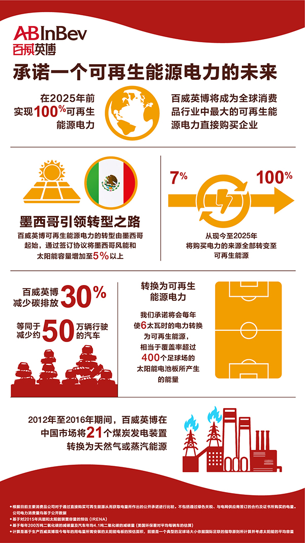 從墨西哥開始到全球其他市場,可再生能源電力目標將使百威英博每年能將其運營市場約6太瓦時的電力轉換為可再生能源,推動阿根廷、巴西、印度和南非等發展中國家的能源行業轉型,解決這些國家面臨的能源挑戰。增加的容量大約相當于一年內覆蓋率超過400個足球場的太陽能電池板所產生的能量,將助力實現2015年巴黎聯合國氣候大會2015ParisClimateConference(COP21)制定的氣候目標。