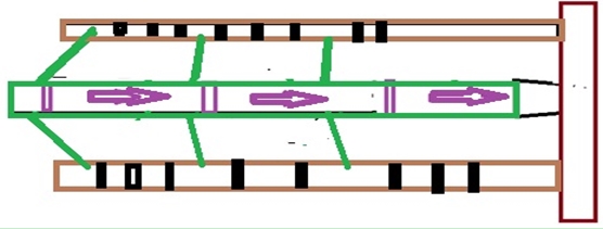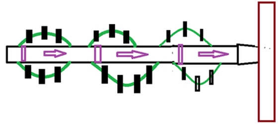 本模式分枝發(fā)明(25)中(詳見《能源用不完模式的分枝發(fā)明》),直接講了串聯(lián)水機的科學(xué)使用方法。即:連天一線串“葫蘆”:水機科學(xué)串聯(lián)法(盡可能多水機串聯(lián)法)。 串聯(lián)和并聯(lián),是電力學(xué)當中的基本概念,但這些方法可不止于輸電一途,像用一根線串起珠子,并且具有特殊功能,就成了念珠或贊珠(泰斯比哈)了。這里串聯(lián)法的用途是用一條水道科學(xué)地串起盡可能多的水機來,即水機串聯(lián)法,筆者就用“連天一線串‘葫蘆’”這句話來稱呼。如下圖所示。講科學(xué)布局,除了串聯(lián),還有并聯(lián),筆者在前面文章中都有涉及,這里主要講一條水道串聯(lián)水機數(shù)量,即水機的安裝密度問題。其它水道依此復(fù)制即可。爭取盡可能地不浪費水,不浪費其它珍貴的配套資源,取得最佳綜合效益,這是筆者給科學(xué)工作者提出的一個基本目標和要求。筆者認為這一點非常重要。這牽涉到一條水道串聯(lián)安裝水機的最佳間距與最佳綜合效益問題(也就是一條水道的水機安裝密度問題)。