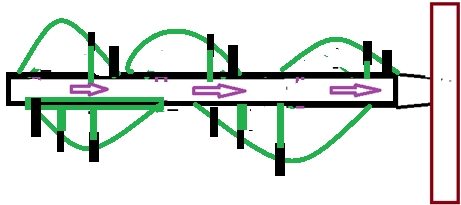 其二,如下圖所示。只要總水量充足,這種中小型是可以沿河建設的,水道數量可以根據需要增加(事實上,另起鍋灶選址再建,遠不如不動鍋灶多建水道來得方便,筆者建議)。這說明什么呢?說明前面所講的沿河改道型工程模式與本中小型樣式比較后就知道已經完全沒有必要建設了。對不對?近日筆者對二者作了比較,在比較后就以本文告訴專家朋友,改道型存在著諸如泥沙等等很多致命因素,而這種人造骨高度能新能源模式是不存在那些問題的(因它主要利用垂直加速度帶來力量,并且進入水道前都是經過過濾的,是非常干凈的凈水,不存在泥沙問題),而那種改道型僅靠沖擊力量難以帶動100萬千瓦的水輪機,投資還非常巨大,遠遠不如本模式好。