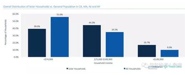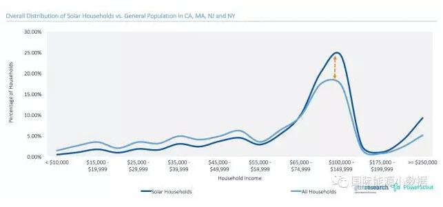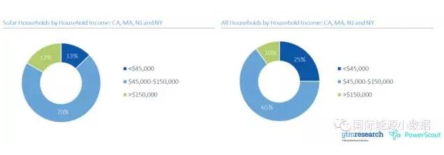 那么,屋頂光伏是不是真的只是富人“玩具”?GTM Research和PowerScout公司針對這一問題對美國加利福尼亞、馬薩諸塞、新澤西、紐約四個州的50多萬戶屋頂光伏用戶(“光伏家庭”)進行統計分析,得出以下結論: