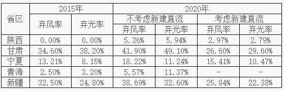“十三五”規(guī)劃期間,西北區(qū)域各省(區(qū))將建設(shè)數(shù)項跨區(qū)外送的特高壓直流輸電工程,如陜北-江西直流輸電工程、酒泉-湖南直流輸電工程、寧東-浙江直流輸電工程、“疆電外送”系列工程等,在模擬計算中可以得知,如果考慮將新能源通過直流輸電工程打捆外送,將顯著降低西北地區(qū)棄風(fēng)棄光電量,提高新能源消納水平。可以預(yù)見,新能源通過直流跨區(qū)外送將成為未來西北區(qū)域各省(區(qū))提高可再生能源利用率,促進新能源消納的重要方式之一。