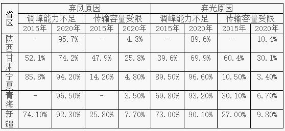 西北區(qū)域棄風(fēng)棄光的兩大主要原因為系統(tǒng)調(diào)峰能力不足和傳輸容量受限。由表3,隨著西北區(qū)域電源電網(wǎng)的發(fā)展,兩大原因?qū)夛L(fēng)棄光的影響占比正在發(fā)生變化。2015年調(diào)峰能力不足已是西北電網(wǎng)棄風(fēng)棄光的主導(dǎo)因素,但新能源傳輸容量受限問題依然不容忽視。2020年對于西北大部分省份來說,傳輸容量受限的導(dǎo)致棄風(fēng)棄光占比已經(jīng)很小,而調(diào)峰能力不足問題將會越來越嚴重。