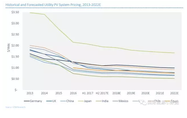 根據GTMResearch提供的數據,2017年大型地面光伏系統價格日本最高,達到2.07美元/瓦(DC),而印度最低,僅為0.65美元/瓦;而中國的成本為0.80美元/瓦。