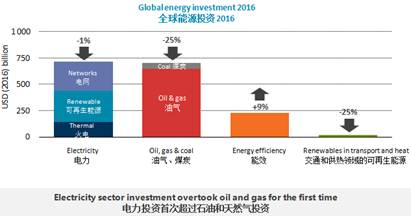 2016的全球能源投資為1.7萬億美元,占全球國內生產總值(GDP)的2.2%。其中,電力部門投資首次超過石油、天然氣和煤炭的投資總和,而清潔能源的投資占總投資的43%,創歷史新高。