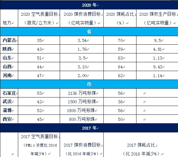 地方試點目標:在2020年地方空氣質量和煤控指標的約束下,2017年地方試點空氣質量和煤耗目標需滿足“大氣十條”的要求,尤其京津冀及周邊地區空氣質量要有明顯改善見,表1。