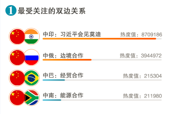 2017廈門金磚峰會召開期間,金磚五國最受關注,由熱度值從高到低排列依次為中國、俄羅斯、印度、巴西、南非。與之相應的,習近平也成為最受關注的金磚峰會國家領導人。