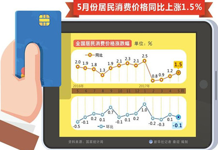 國家統計局今天發布的2017年5月份全國居民消費價格指數(CPI)和工業生產者出廠價格指數(PPI)數據顯示,CPI環比下降0.1%,同比上漲1.5%;PPI環比下降0.3%,同比上漲5.5%。對此,國家統計局城市司高級... [詳細]