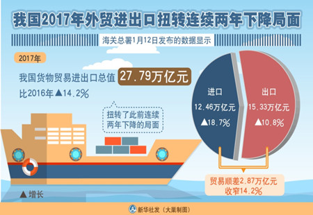 2017年中國進出口額同比增速創三年新高中國海關總署12日公布的最新數據顯示,2017年中國貨物貿易進出口總值27.79萬億元(人民幣,下同),同比增長14.2%,系2015年以來首次增長。其中,出口15.33萬億元,同比增長10.8%;進口12.46萬億元,... [詳細]